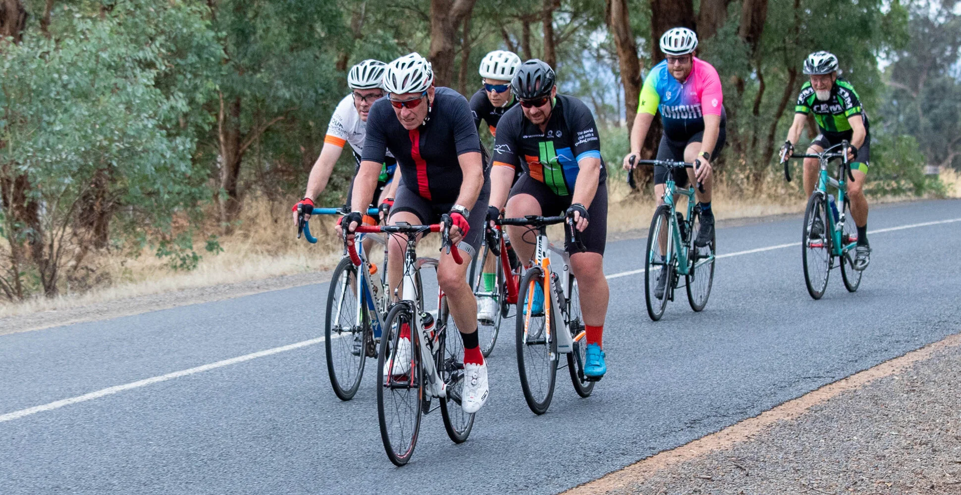 The groups ahead were mostly spared Josh's cycling lesson and had stayed away for the u-turn at Cummins Road. They began their march back into the headwind, still in good positions. Di had forged on alone to still be leading with 11 kilometres remaining. Janine and Justin had collected Tim, Craig, Andrew and Steve ahead to form a strong bunch that potentially could ride away, while the faster groups behind were marshalling together to also still be in with a chance.