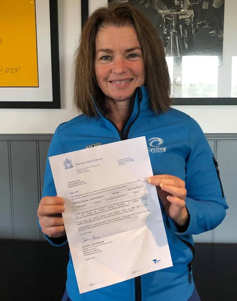 The money secured through SRV's 'Change Our Game Scholarship' has been awarded to Jodie to assist her climb through the cycling Commissaire ranks both at a National and International level.
